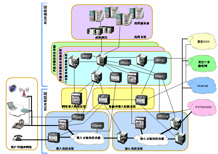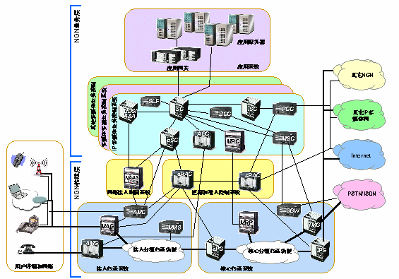 NGN網(wǎng)絡(luò)邏輯上可分為用戶網(wǎng)、接入網(wǎng)和核心網(wǎng)。網(wǎng)絡(luò)的管理界限將NGN劃分為一些不同的NGN域。接入網(wǎng)和核心網(wǎng)可在同一NGN域中,也可以屬于不同的域。域內(nèi)的網(wǎng)絡(luò)拓?fù)湫畔⒖梢詫ν馄帘。域和域之間的互通將通過網(wǎng)關(guān)來完成。NGN支持與現(xiàn)有的網(wǎng)絡(luò)互通,如電話網(wǎng)絡(luò)、蜂窩網(wǎng)絡(luò)、互聯(lián)網(wǎng)等。NGN還支持各種有"NGN意識"的用戶設(shè)備和現(xiàn)有的無"NGN意識"的終端,如模擬電話機(jī)、傳真機(jī)、ISDN終端等。這些互通都通過網(wǎng)關(guān)來完成。NGN的網(wǎng)關(guān)主要包括多媒體接入網(wǎng)關(guān)、接入媒體網(wǎng)關(guān)、中繼媒體網(wǎng)關(guān)、分組網(wǎng)關(guān)和信令網(wǎng)關(guān)。