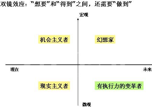 第一種右上角是“幻想家”,把目前工作的重點(diǎn)放在宏觀的角度,不斷憧憬未來(lái),宏觀的理論滔滔不絕,只有理念無(wú)法落地實(shí)施,到頭來(lái)還是流于紙上談兵。