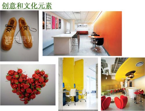 左下邊的這個(gè)圖是我自己非常喜歡的,就是在一個(gè)咖啡館里面,用一些番茄、一些小的辣椒和一些草莓搭成這樣一個(gè)形狀。上面大家看是鞋子,其實(shí)是兩塊面包把中間挖空了,鞋帶是巧克力,用這種方式來(lái)調(diào)動(dòng)別人在咖啡館里面的食欲。我們?cè)谠挿坷锩媸且粯拥,要讓客服代表,特別是那個(gè)年齡段20-25歲之間年輕的男孩子和女孩子們喜歡,甚至他們有一種重回學(xué)校的感覺都可以。所以這里面不用花太多的心思可以有很好的創(chuàng)意。在這個(gè)話房的設(shè)計(jì)當(dāng)中,覺得從環(huán)境的角度和自己能夠著手去改變的角度來(lái)看,已經(jīng)可以把你得話房做出自己的特色,就像我們?cè)谧约杭依镅b修一樣,可以有不同的色彩,也可以由不同的結(jié)構(gòu),當(dāng)然需要滿足公司給你預(yù)算的要求。