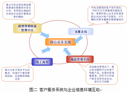 客戶服務(wù)系統(tǒng)不是孤立的系統(tǒng),是能夠與客戶現(xiàn)有信息環(huán)境,包括:核心業(yè)務(wù)系統(tǒng)、多渠道營銷、電子商務(wù)等進行互動的智能信息系統(tǒng),從而使呼叫中心成為企業(yè)的戰(zhàn)略資產(chǎn),幫助企業(yè)提升客戶滿意度、深度挖掘客戶價值?蛻舴⻊(wù)系統(tǒng)與企業(yè)其它信息系統(tǒng)的互動可以通過圖二反映。