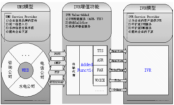 (二)IVR系統(tǒng)的傳統(tǒng)缺點是缺乏智能化,流程更改困難,播放的語音或者內(nèi)容必須預(yù)先錄制.所以我們提供UMS服務(wù),增強IVR的功能. 使我們的IVR功能增強(Ext-IVR Service Provider)