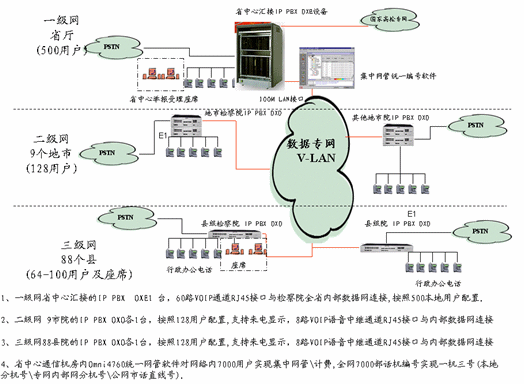 根據(jù)合同,阿爾卡特將提供1套Omni PCX Enterprise(面向大中型企業(yè)的通信平臺(tái))500用戶作為核心交換節(jié)點(diǎn),97套Omni PCX Office(面向中小型企業(yè)的通信平臺(tái))系統(tǒng)分別為60-160用戶作為分支交互節(jié)點(diǎn)。全網(wǎng)支持多達(dá)7000多個(gè)用戶,覆蓋貴州省檢察院、9個(gè)地市檢察院和88個(gè)區(qū)縣檢察院。在設(shè)計(jì)組網(wǎng)方案時(shí),阿爾卡特根據(jù)用戶的需求和實(shí)際情況,并充分考慮現(xiàn)有的數(shù)據(jù)網(wǎng)絡(luò)資源,提出采用點(diǎn)對(duì)多點(diǎn)的網(wǎng)絡(luò)結(jié)構(gòu)建設(shè)VOIP語(yǔ)音網(wǎng)絡(luò),不僅可以充分保障通信的安全性和可靠性,同時(shí)還可最大限度保護(hù)現(xiàn)有投資,節(jié)省費(fèi)用。