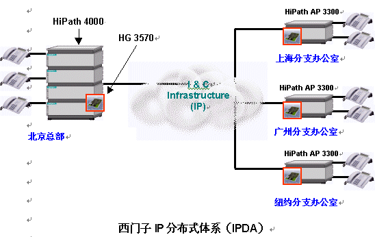 IP分布式體系(IPDA)建于西門子HiPath通信平臺之上,它能解決您的上述煩惱。在各分支辦公室部署HiPath接入點(Access Point)后,同時在集成IP網(wǎng)關HiPath HG 3500家族的幫助下,HiPath能夠建立起一個將所有分支辦公室包括在內(nèi)的IP通信網(wǎng)絡。