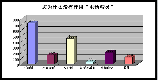 尚有相當(dāng)多地區(qū)沒有開通此類服務(wù),用戶感到遺憾。在“您為什么沒有使用‘電話精靈’?”的統(tǒng)計結(jié)果中“當(dāng)?shù)貨]有開通”是一項主要原因,有不少用戶都留言希望能將電話精靈業(yè)務(wù)在更廣泛地區(qū)應(yīng)用。曾經(jīng)使用過“電話精靈”,但后期由于運(yùn)營商停止了此項業(yè)務(wù)而不再使用的用戶也深感遺憾。