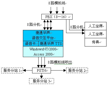 適用于中小型企事業(yè)單位的分布式客戶服務(wù)系統(tǒng)。特點(diǎn)是一半的線路資源用于交互系統(tǒng),另一半線路資源用于向分布下達(dá)服務(wù)指令。采用該方案的最大好處就是用戶的服務(wù)請求能夠以最快的速度自動分配到最合適的服務(wù)分站中,再由服務(wù)分站根據(jù)客戶的具體要求執(zhí)行服務(wù)。