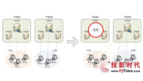 當一個子系統(tǒng)出現(xiàn)故障時,系統(tǒng)可以自動將故障子系統(tǒng)上的會議遷移到其他子系統(tǒng)上,做到子系統(tǒng)互為備份,極大提高了系統(tǒng)的運行支撐能力。