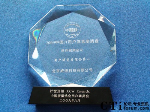 CTI論壇(ctiforum)09月03日消息: 在27日剛剛結(jié)束的“2009中國IT用戶滿意度年會”上,威速科技喜獲“2009軟件視頻會議IT用戶滿意度綜合第一”大獎。憑借在產(chǎn)品與服務(wù)方面多年的優(yōu)異表現(xiàn),成立10周年的威速科技連續(xù)9年獲此殊榮,這也充分彰顯了威速科技已成為視頻會議軟件市場上公認的滿意品牌。