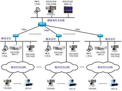 在株洲、邵陽和永州市行采用級聯(lián)的方式來實現(xiàn)。具體實現(xiàn)方式為: 寶利通新型視頻會議終端VSX 7000E則和地市行的寶利通多點控制單元(MCU)MGC-25通訊,并且MGC-25負責其縣支行終端的接入,同時用MGC-50和MGC-25的端口級聯(lián),采用這種連接方式就可以實現(xiàn)從省行-地市行-縣支行的三級網(wǎng)視頻會議的召開。
