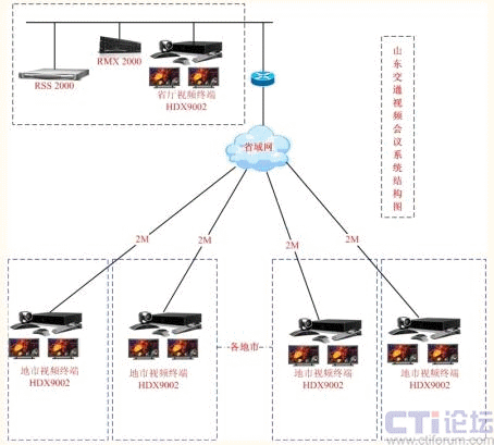 山東省交通廳高清視頻會議系統(tǒng)架構在一個完善的、高性能的TCP/IP網(wǎng)絡基礎之上,基于交通廳全新開通的2M專線光纖網(wǎng)絡,以省交通廳為主會場,全省各地市交通局(委)為分會場,共18個會場。