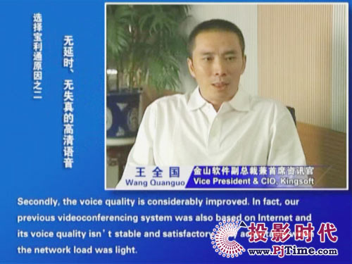 金山軟件副總裁兼首席資訊官王全國(guó)先生說(shuō)道:“對(duì)于軟件行業(yè)來(lái)說(shuō),及時(shí)、高效的溝通是保持競(jìng)爭(zhēng)優(yōu)勢(shì)的重要前提。相比之前使用的標(biāo)清產(chǎn)品,寶利通高清視頻會(huì)議系統(tǒng),提供了完全不同的體驗(yàn),流暢的高清晰畫面猶如真實(shí)的面對(duì)面溝通。而且我們公司并沒(méi)有申請(qǐng)專線,所有的應(yīng)用都是基于公網(wǎng)實(shí)現(xiàn)的。另一方面,新型全中文定制菜單的運(yùn)用,令我們使用起來(lái)非常方便,這更提高了我們使用視頻通信手段實(shí)現(xiàn)異地溝通的熱情!
