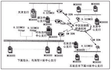 為推進(jìn)金融行業(yè)的金融電子化進(jìn)程,并充分利用中國(guó)國(guó)家金融數(shù)據(jù)通信網(wǎng)(CNFN)的資源,中國(guó)人民銀行天津大區(qū)行于1999年建立了首個(gè)運(yùn)行在CNFN上的基于IP的H.323電視會(huì)議網(wǎng),實(shí)現(xiàn)了華北范圍內(nèi)天津、內(nèi)蒙古、河北、山西兩省一區(qū)一市的36家人民銀行機(jī)構(gòu)的會(huì)議電視聯(lián)網(wǎng)。VCON公司提供的基于IP的H.323視頻會(huì)議第四代解決方案在該系統(tǒng)中發(fā)揮了重要作用。