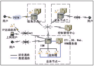 每個業(yè)務(wù)節(jié)點都由ISM(智能交換模塊)、CTI服務(wù)器、DB(數(shù)據(jù)庫)、VRM(語音資源模塊)和座席等模塊構(gòu)成,下面逐一介紹各模塊的作用和功能。