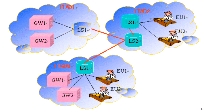 圖中的紅線是TRIP協(xié)議控制下的各個(gè)域中網(wǎng)關(guān)路由信息在LS之間被聚合、被交換、被廣播、被同步的路徑。各個(gè)ITAD管理者首先簽訂適用于交互網(wǎng)關(guān)信息的TRIP協(xié)議,然后通過管理手段建立起這些信息共享的聯(lián)合體,一個(gè)域中的LS同其它域中的LS都成為聯(lián)合體的一員,于是這些LS通過這種方式就可以交換網(wǎng)關(guān)信息了。在圖中,ITAD1的LS1與ITAD2的LS1相連,ITAD2的LS2又依次與ITAD3的LS1相連通,通過TRIP協(xié)議,ITAD2的LS2就可以了解ITAD1上的兩個(gè)網(wǎng)關(guān),這兩個(gè)網(wǎng)關(guān)的網(wǎng)關(guān)路由信息就可以由ITAD2的終端用戶通過其前端(front-end)進(jìn)行訪問。在ITAD3中,既有終端用戶,又有網(wǎng)關(guān),ITAD3的LS1通過ITAD2上LS2已經(jīng)聚合后的廣播消息來了解ITAD1上的網(wǎng)關(guān)。