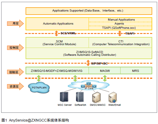 中興通訊AnyService@ZXNGCC多媒體統(tǒng)一接觸中心系統(tǒng)以中興通訊ZXMSQ10多媒體軟排隊機系統(tǒng)為基礎,基于軟交換技術。ZXMSQ10由接入網(wǎng)關和軟排隊機兩個核心部件組成,語音、視頻呼叫(呼入和呼出)通過ZXMSQ10多媒體軟排隊機匯聚到AnyService@ZXNGCC系統(tǒng),其他媒體通過MAGW接入到NGCC系統(tǒng),同時AnyService@ZXNGCC也選擇最佳的媒體類型將信息主動反饋給用戶,形成雙向溝通的渠道,實現(xiàn)呼叫中心系統(tǒng)的被動服務和主動服務。