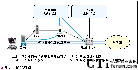Mb/s為例,一個1 500個扇區(qū)的HSDPA網絡所產生的數據量為21.6 Gb/s。目前業(yè)界RNC的數據吞吐量僅達到1 Gb/s。今天各運營商建設的3G網絡與2G共用核心網,其帶寬和數據處理能力遠遠不能滿足HSPA高數據率的需求。當數據負荷激增時運營商將面對RNC/SGSN的擴容的巨大壓力。此外在每一個節(jié)點處對數據包的重新拆裝會導致在每一節(jié)點都要引入額外的時延。結果會產生較長的網絡時延。對于移動互聯(lián)網應用,這種多層次的網絡結構是沒有必要的。使網絡扁平化不僅可以簡化設備降低成本,還可以減少時延。I-HSPA應運而生。這種架構把基站通過Gi/Gn口直接連接到GGSN節(jié)點(通向互聯(lián)網和數據業(yè)務的網關)[5]。I-HSPA原理如圖3所示。