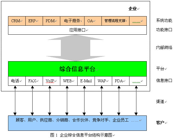 那企業(yè)為客戶服務(wù)時(shí),如何既能做到快速的響應(yīng),又能保證高質(zhì)量呢?在我們所接觸的眾多客戶和參加Call Center培訓(xùn)的學(xué)員中,有很多人提出這樣的問題。他們說,我們的企業(yè)已經(jīng)使用了諸如ERP、OA等系統(tǒng),現(xiàn)在你們又提BPR、CRM、CALL CENTER、電子商務(wù)等,它們之間是什么關(guān)系,怎么實(shí)施,我想這是目前眾多企業(yè)所面臨的普遍問題,這也正是企業(yè)信息化建設(shè)過程中必須解決的問題。企業(yè)信息化建設(shè)是一個(gè)整體的系統(tǒng)解決方案,各個(gè)信息化模塊(環(huán)節(jié))都在履行自己的業(yè)務(wù)處理功能和信息處理功能,相互之間又有著各種內(nèi)在的聯(lián)系。我們知道,ERP解決的是諸如倉庫庫存、銷售訂單、生產(chǎn)與成本控制,等等;BRP解決的是管理流程優(yōu)化、崗位、崗位職責(zé)等問題;CRM主要是針對市場、銷售和客戶服務(wù),提供客戶管理及數(shù)據(jù)分析功能。事實(shí)告訴我們,上述這些信息化模塊目前只能提供單一或僅有幾種與客戶溝通的方式,例如Web、E-mail,個(gè)別CRM軟件提供電話接入功能,此外,它們都不提供專職的客戶服務(wù)坐席,更不必說提供柔性化的、人性化的、雙向互動的服務(wù)了。因此,實(shí)際上企業(yè)就迫切需要建設(shè)一個(gè)綜合的信息平臺,以此向客戶提供方便的、多種聯(lián)絡(luò)方式的、足夠容量的、良好服務(wù)質(zhì)量的、較高效率和較低成本的溝通渠道。通過這樣的渠道,企業(yè)可以與客戶建立溝通關(guān)系,滿足客戶對企業(yè)多樣的、變化的需求。