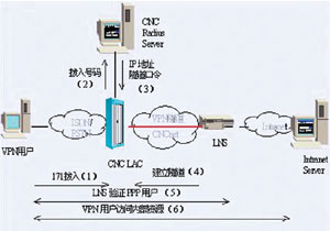 在網(wǎng)通有限公司為中建總公司建設(shè)的網(wǎng)絡(luò)中,當(dāng)用戶撥上網(wǎng)絡(luò)時,網(wǎng)通有限公司的認(rèn)證系統(tǒng)會根據(jù)帶域名的用戶名確定是哪個地區(qū)的VPDN用戶,并通過一系列步驟實(shí)現(xiàn)用戶與企業(yè)之間的內(nèi)部通信。