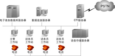 中型呼叫中心:座席代表在50~100之間。據(jù)專業(yè)數(shù)據(jù)統(tǒng)計(jì)公司預(yù)測(cè),中型系統(tǒng)需求量最大,因此不少呼叫中心軟、硬件開發(fā)商對(duì)準(zhǔn)這一目標(biāo)進(jìn)行開發(fā)。這種系統(tǒng)結(jié)構(gòu)相對(duì)簡(jiǎn)單,投資也少,容易被中、小企業(yè)所接受。目前我國(guó)的一些公司開發(fā)系統(tǒng)多屬于此種類型。它可以省掉大型交換機(jī)的投資,而利用PBX與CTI服務(wù)器和業(yè)務(wù)代表座席直接相連,業(yè)務(wù)代表席同時(shí)與應(yīng)用服務(wù)器相連,客戶資料也存在應(yīng)用服務(wù)器中,可實(shí)時(shí)地將接入電話的客戶姓名自動(dòng)在計(jì)算機(jī)屏幕上彈出。CTI服務(wù)器一般由CTI硬件開發(fā)商的板卡和PC組成,其擴(kuò)容和增加功能也比較方便,成本也低,因此是一種投資小、見效快、升級(jí)也很靈活的系統(tǒng)。