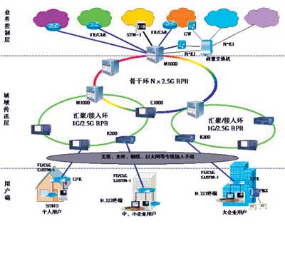 絡(luò)明網(wǎng)絡(luò)的RPR解決方案是將RPR技術(shù)、MPLS技術(shù)、時(shí)鐘同步技術(shù)、CWDM技術(shù)和電視視頻廣播技術(shù)結(jié)合在一起而提供的面向IP優(yōu)化,并同時(shí)支持TDM業(yè)務(wù)的寬帶多業(yè)務(wù)解決方案。Luminous RPR解決方案的網(wǎng)絡(luò)拓?fù)浣Y(jié)構(gòu)如左圖所示。