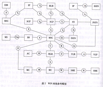 在基于CDMA的無(wú)線智能網(wǎng)方面,北美的TIA/EIA組織頒布了基于CS-2的無(wú)線智能網(wǎng)規(guī)范WIN。WIN分為三個(gè)階段:階段一、預(yù)付費(fèi)階段和階段二。其中階段一支持的主要業(yè)務(wù)有來(lái)話篩選業(yè)務(wù),主叫名字顯示業(yè)務(wù)和語(yǔ)音控制的業(yè)務(wù),預(yù)付費(fèi)階段主要支持預(yù)付費(fèi)業(yè)務(wù),階段二支持被叫集中付費(fèi),立即付費(fèi)等五種業(yè)務(wù)。WIN網(wǎng)絡(luò)參考模型如圖2所示。