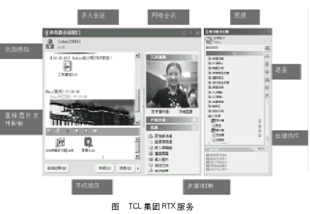 RTX產(chǎn)品支持標(biāo)準(zhǔn)的SIP、H.323 IP電話協(xié)議,并采用高質(zhì)量的QoS技術(shù)保證實時通信網(wǎng)絡(luò)質(zhì)量,使得TCL集團公司的用戶可以與同事之間采用語音或者視頻的面對面的交流(如圖),相當(dāng)于給集團公司的任何一位RTX用戶配備了一部集成的視頻和語音電話。目前這項服務(wù)在集團公司非常受歡迎,尤其是遠程的代表處和集團總部之間的信息交流更直接、更快捷,在一定程度上取代了電話的功能,大大節(jié)約了通信費用。比如,TCL空調(diào)的計劃部每天需要和全國20多個代表處的計劃處進行數(shù)據(jù)往來,以前需要電話完成的功能現(xiàn)在通過RTX的即時文字、短信和語音對講完成,大大提高效率,節(jié)省了通信成本。