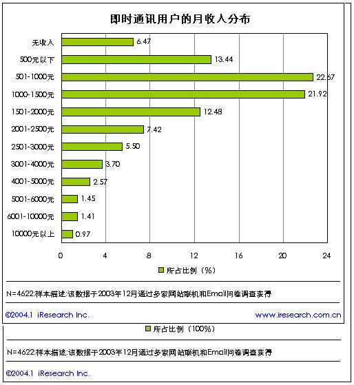 從收入情況來看,即時通訊用戶仍然以低收入為主,其中月收入低于1500元的用戶比例高達(dá)64.5%,這可能與使用即時通訊的用戶主要是學(xué)生和普通公司職員的緣故。
