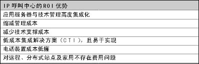 為盡量縮減成本,企業(yè)主管們都在想方設(shè)法引入新型通信技術(shù)改造呼叫中心。IP呼叫中心的ROI優(yōu)勢(shì)在于:應(yīng)用服務(wù)器與技術(shù)管理高度集成化;縮減管理成本;減少技術(shù)支撐成本;低成本集成解決方案(CTI),且易于實(shí)現(xiàn);電話(huà)裝置成本低廉;對(duì)遠(yuǎn)程、分布式站點(diǎn)及家用不存在費(fèi)用問(wèn)題。