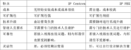 運(yùn)營商自然不會(huì)聽之任之,因此推出了IP Centrex業(yè)務(wù)與其相抗衡。由附表可以很明顯地看出,與IP PBX相比,IP Centrex的優(yōu)勢(shì)有:初期投入成本小、以辦公費(fèi)用方式容易控制現(xiàn)金流;無須對(duì)網(wǎng)絡(luò)、業(yè)務(wù)平臺(tái)進(jìn)行維護(hù);平臺(tái)規(guī)模與公司規(guī)模同步增長(zhǎng);具有對(duì)公網(wǎng)的開放性;辦公地點(diǎn)的任意性、易擴(kuò)展;使企業(yè)集中在主營業(yè)務(wù)領(lǐng)域;業(yè)務(wù)可擴(kuò)展性好。