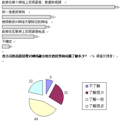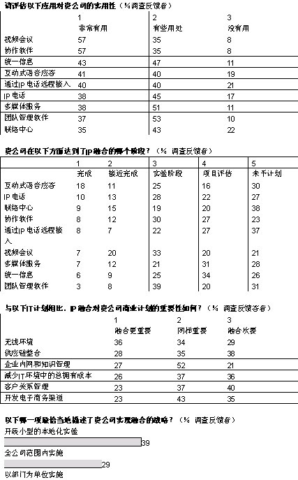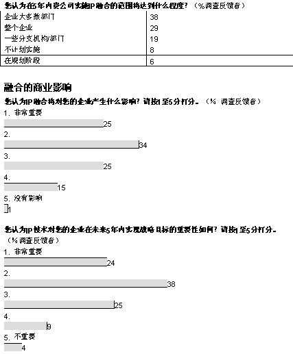 融合網(wǎng)絡(luò)已經(jīng)成為現(xiàn)實。在經(jīng)濟學(xué)家信息部展開的全球調(diào)查中,103位高級經(jīng)理中超過半數(shù)的人投票表示,他們的企業(yè)已經(jīng)開始實施IP網(wǎng)絡(luò)融合,還有26%表示他們將計劃部署。