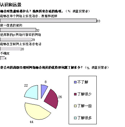 從更為廣泛的層面上看,我們的調(diào)查結(jié)果顯示:三分之一的管理人員對融合網(wǎng)絡(luò)的益處一無所知或者知之甚少。困惑的并不僅是高級經(jīng)理們:分析公司IDC近期對歐洲600余名廣域網(wǎng)管理人員進行的調(diào)查顯示,只有五分之一的人能夠完全了解融合網(wǎng)絡(luò)所實現(xiàn)的各項功能。