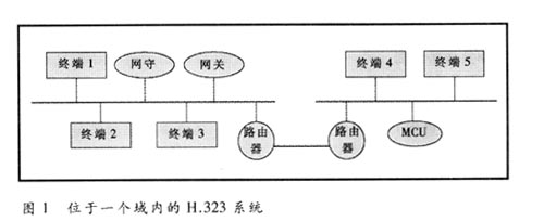 一個(gè)簡單的基于H.323的視訊會(huì)議系統(tǒng)包括網(wǎng)守(GK)、網(wǎng)關(guān)(GW)、多點(diǎn)控制單元(MCU)和所有終端的集合。圖1是在常見的一種域類型中的H.323系統(tǒng)。