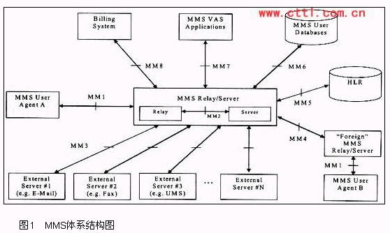 重復(fù)使用的原有網(wǎng)元有HLR,它通過(guò)MM5接口向MMSC提供用戶(hù)簽約信息。圖1列出了目前MMS系統(tǒng)中常用的接口是MMI-MM8。這些接口遵循相應(yīng)的接口規(guī)范。
