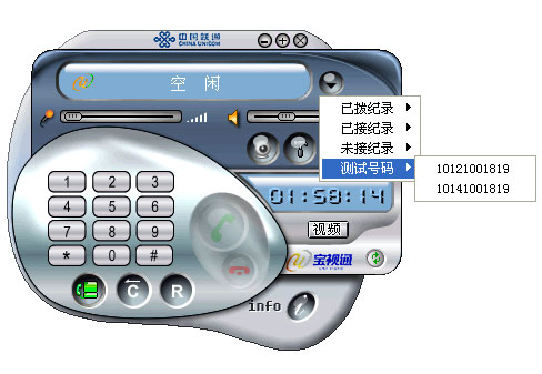 通話記錄很詳細(xì),除了“已撥”、“已接”、“未接”外,還有一項(xiàng)“測(cè)試號(hào)碼”,可以讓用戶撥打聯(lián)通“寶視通”的服務(wù)熱線測(cè)試可視電話是否正常工作,也可以向服務(wù)人員詢問相關(guān)的服務(wù)內(nèi)容。