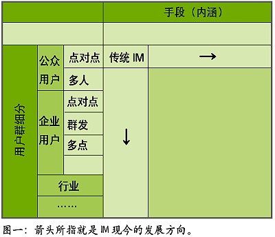 IT行業(yè)發(fā)展數(shù)十年,有一個(gè)共識(shí),或是一種經(jīng)驗(yàn)結(jié)論,大約是:在用“老工具解決新問題”、“老工具解決老問題”、“新工具解決老問題”、“新工具解決新問題”四者中,一般最先者最善,也極討巧,最后者則最為事倍功半。觀IM發(fā)展趨勢,似乎介于“新工具解決老問題”、“新工具解決新問題”二者之間,就體現(xiàn)在表中兩個(gè)箭頭上,是以錢景堪憂。