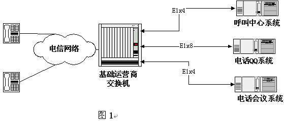 一種方式為固定分配, 即為每種語音系統(tǒng)分配固定數(shù)量的E1中繼,如圖1所示,這種方式的問題主要有兩個方面:一是中繼資源沒有充分共享使用,比如在晚上,可能電話QQ業(yè)務(wù)量很大而呼叫中心很小,而白天卻正好相反。如果為每一種業(yè)務(wù)都留有很大的中繼富裕又勢必導致中繼資源的浪費;二是當中繼線路來源于多個運營商時存在連接上的困難。