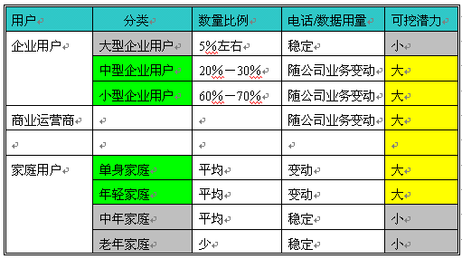 從以上表格可以清楚的顯示中小企業(yè)、商業(yè)運(yùn)營商、年青用戶對(duì)電話和數(shù)據(jù)的使用不穩(wěn)定,這就意味者可發(fā)展、擴(kuò)大使用的可能性非常大,是企業(yè)增加收入的潛在用戶,但最主要的是如何提高這些用戶的使用呢?經(jīng)濟(jì)規(guī)律告訴我們?nèi)绻闾峁┑纳唐穼?duì)用戶有用,同時(shí)價(jià)廉、物美,用戶是不會(huì)拒絕的。對(duì)于電話運(yùn)營商來講就是提供給企業(yè)帶來方便、效率、節(jié)省成本、方便管理的服務(wù)的同時(shí),提高有效接通率。