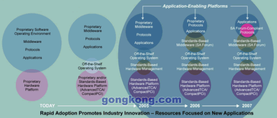 計(jì)算機(jī)和通信業(yè)已經(jīng)堅(jiān)定的向開放標(biāo)準(zhǔn)演進(jìn)。例如,Linux已經(jīng)被作為OS大量采用,計(jì)算模塊已經(jīng)遵循各種規(guī)范標(biāo)準(zhǔn)來(lái)設(shè)計(jì),具有標(biāo)準(zhǔn)接口,如CPCI和ATCA。如果TEM繼續(xù)采用目前的方法集成計(jì)算機(jī)硬件和軟件模塊,全面標(biāo)準(zhǔn)化將是一個(gè)緩慢延進(jìn)的過(guò)程。下一步將是基于標(biāo)準(zhǔn)的硬件平臺(tái)管理,最終可能在本年代末,遵循SAF的中間件及其上運(yùn)行的應(yīng)用。
