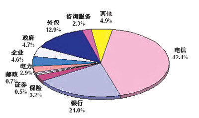 2004年中國呼叫中心席位總數(shù)為14萬個,從不同行業(yè)呼叫中心席位數(shù)量看,電信行業(yè)占據(jù)60%以上的市場份額,制造企業(yè)占6.5%,政府占5.65%,銀行占5.58%。2004年中國呼叫中心投入205.0億元,從不同行業(yè)呼叫中心投入絕對值看,電信行業(yè)占據(jù)42.4%,銀行占21.0%,外包占12.9%,其他行業(yè)市場份額均低于5.0%。