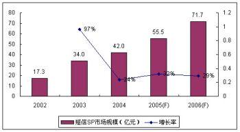 繼2004年中國政府和運營商監(jiān)管力度的加大,2005年的短信SP市場規(guī)模增長率為32%,SP市場規(guī)模55.5億元,比2004年略有上升;谀壳岸绦攀袌鲈隽渴袌龅目s小,其增長主要依靠對存量市場需求的深度挖掘。諾盛預(yù)計2006年的短信市場繼續(xù)保持平穩(wěn)的增長勢頭,增長率將達(dá)29%。