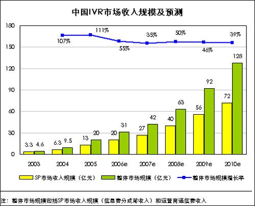 iResearch通過研究分析,2005年中國IVR市場總體收入規(guī)模(包括通信費及信息費)為20億元,2006年將達(dá)到31億元,預(yù)計到2010年將達(dá)到128億元,市場增長率將呈現(xiàn)逐步下降的趨勢。其中IVR市場中SP的收入規(guī)模在2005年為13億元,2006年將達(dá)到20億元。