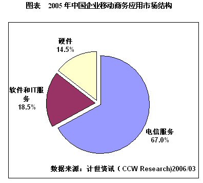 目前,我國移動商務市場仍處于萌芽期,根據(jù)計世資訊(CCW Research)《2005-2006中國移動商務應用發(fā)展趨勢研究報告》數(shù)據(jù),2005年中國企業(yè)移動商務應用市場規(guī)模為112.5億元,其中硬件投資為16.3億元,軟件與IT服務投資為20.8億元,電信服務投資達到75.4億元,占有整體市場的67.0%。