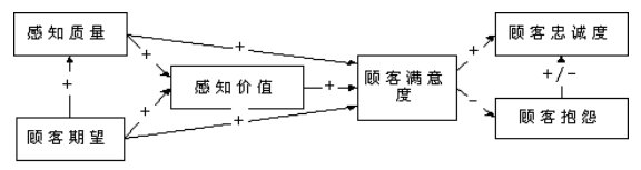 該模型是由六個(gè)隱變量組成的因果模型,其中顧客滿意度是最終要求的目標(biāo)變量,感知質(zhì)量、感知價(jià)值和顧客期望是因變量,而顧客忠誠度和顧客抱怨則是顧客滿意與否的結(jié)果變量。