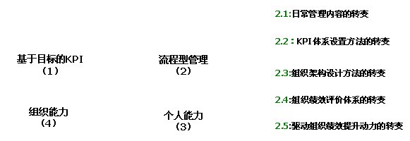 如圖1中的第(1)部分所示,客戶服務中心原來的管理是基于目標KPI的管理,為了有效實施“流程型”管理,必須將其轉變“流程型”管理的組織,即必須將原來基于目標的KPI管理轉變?yōu)榛诹鞒痰腒PI管理和流程(過程)管理(如圖1中的第(2)部分所示)。同時,通過對員工培訓組織所具有的一流的流程,使員工按照流程能力產(chǎn)生一流的績效,實現(xiàn)組織向員工的能力傳遞,有效提高每個員工的個體能力(如圖1中的第(3)部分所示);通過統(tǒng)一規(guī)范的流程保證個體行為的一致性,從而保證組織的能力,從而推動整個團隊組織能力的提升(如圖1中的第(4)部分所示),最終通過組織能力保證組織目標績效的實現(xiàn)(如圖1中的第(1)部分所示)。