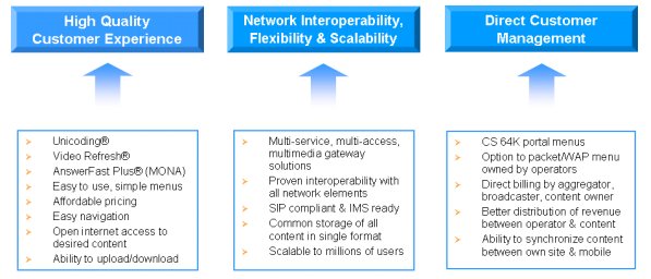 Refresh®和AnswerFast Plus® (MONA的一部分),同時多媒體網關解決方案也包括在內。其它方面的可互操作性和用戶體驗改善問題很容易能解決,對今天現(xiàn)有的WAP服務是一種補充。