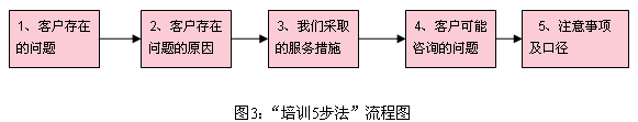 我們要求所有培訓課件都按“客戶存在的問題→客戶存在問題的原因→我們采取的服務措施→客戶可能咨詢的問題→注意事項及口徑”這五步進行編纂。各步驟含義說明如下: