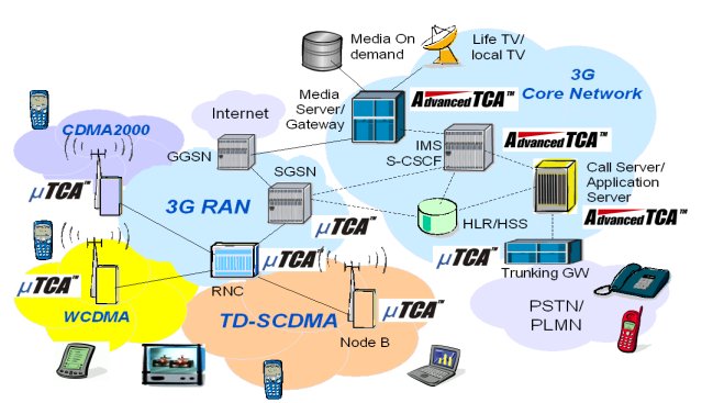 3G網(wǎng)絡中占主要地位的三個無線接入標準是WCDMA、TD-SCDMA與CDMA2000。3GPP與業(yè)界廠商對網(wǎng)絡結(jié)構的標準化做出的杰出努力,為在世界范圍內(nèi)成功布署3G網(wǎng)絡業(yè)務起到了至關重要的作用。不過,3G網(wǎng)絡是復雜的系統(tǒng),包含有多種多樣的網(wǎng)元設備,AdvancedTCA與MicroTCA技術的出現(xiàn)把它的實現(xiàn)方式引向了標準化的道路,即通過商用組件快速、低成本地布署3G網(wǎng)絡,減少了各種獨立的實現(xiàn)方式的復雜性,提高了互操作性。
