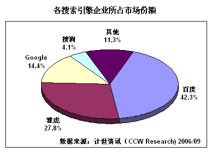 互聯(lián)網(wǎng)上的信息浩如煙海,是典型的信息爆炸,因此絕大多數(shù)網(wǎng)民都必須依靠搜索引擎才能找到所需信息,這個龐大的需求也就注定了搜索引擎市場的興旺繁榮。計世資訊(CCW Research)數(shù)據(jù)顯示:2004年中國的搜索引擎市場銷售總額達到9.4億元人民幣,增長67.9%,2005年繼續(xù)保持47.9%的增長速度,達到13.9億元,到2006年預計這個數(shù)字將突破20億元大關。