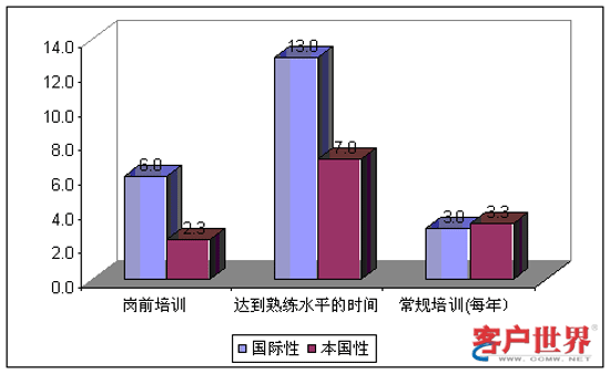 總體看來,印度呼叫中心提供平均為4.1周的崗前培訓。其中,國際性呼叫中心平均提供6周崗前培訓,明顯高于本地性呼叫中心的2.3周。這是因為國際呼叫中心把崗前培訓的相當一部分時間投入到英語能力的培訓和提高上面。此外,參加調研的呼叫中心主管認為,新員工平均在開始工作10周以后才能達到熟練水平。同樣地,我們發(fā)現(xiàn)國際性呼叫中心和本地性呼叫中心在這一指標上存在顯著差異。在國際性呼叫中心需要達到熟練水平的時間