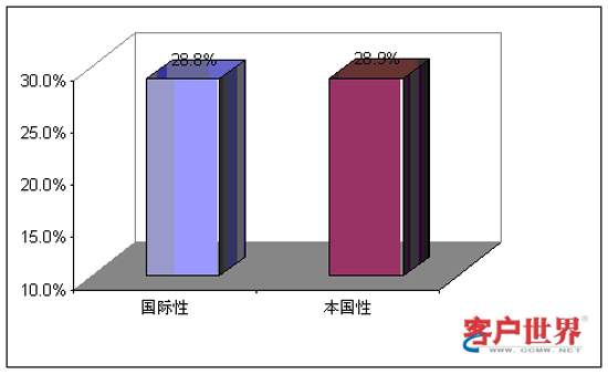 從業(yè)務功能看來,國際性呼叫中心和本國性呼叫中心承擔著不同的角色。9%的國際性呼叫中心和14%的本國性呼叫中心提供僅限于客戶服務,例如賬號查詢和催費收款。39%的國際性呼叫中心和59%的本國性呼叫中心專門展開網上營銷和銷售(外撥為主)。43%的國際性呼叫中心和29%的本國性呼叫中心同時承擔客戶服務和銷售功能。最后,我們調查到9%的國際性呼叫中心專門從事技術支持,而且這些中心專門為國際市場設立。服務功能上的差異會對商業(yè)定位和人力資源管理提出不同的要求。