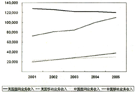美國與中國固網(wǎng)與移動業(yè)務收入比較(單位:百萬美元)